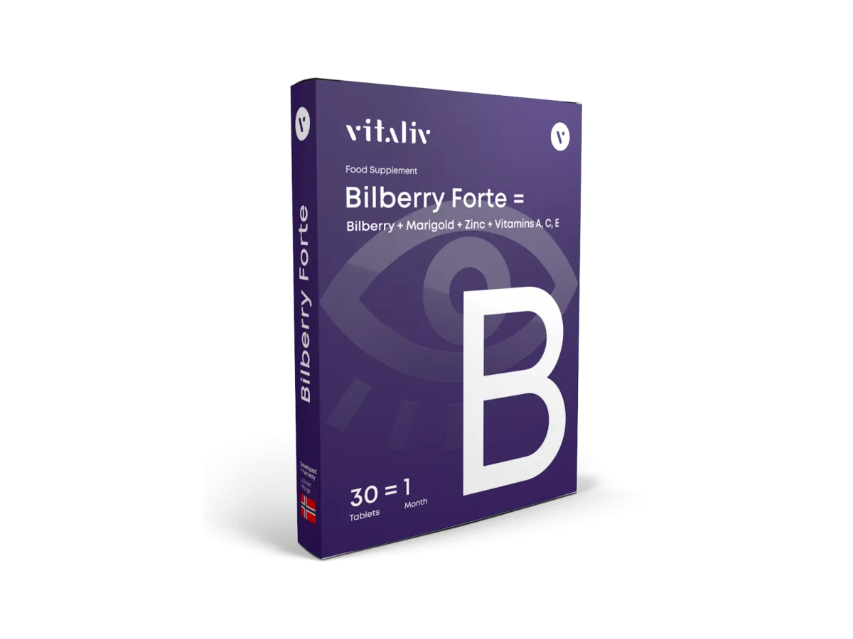Bilberry Forte er et kosttilskud, der indeholder blåbærekstrakt samt zink og vitamin A, som bidrager til at vedligeholde et normalt syn. Prøv Bilberry Forte i 30 dage – helt uden binding.
